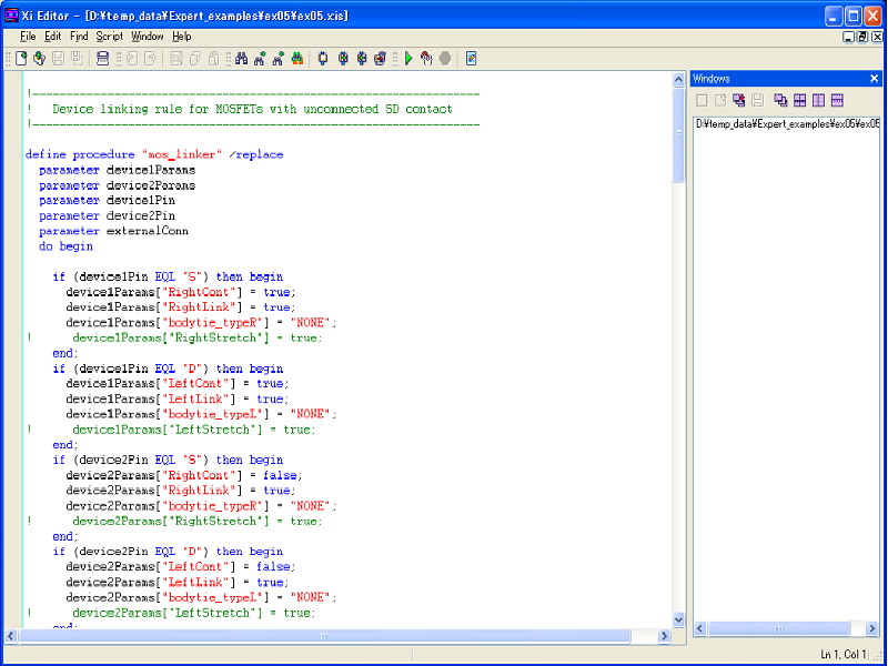 - Select File->Open in the XI script panel to load a sample XI script editing_ex03.xisand run it. It defines the callback function for the device link (see 1_script_panel.png ).