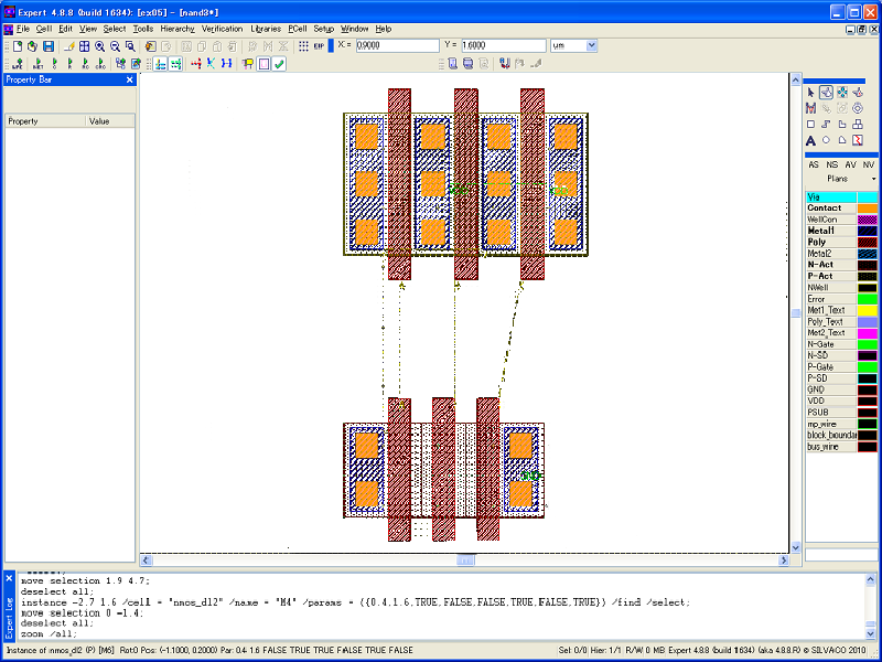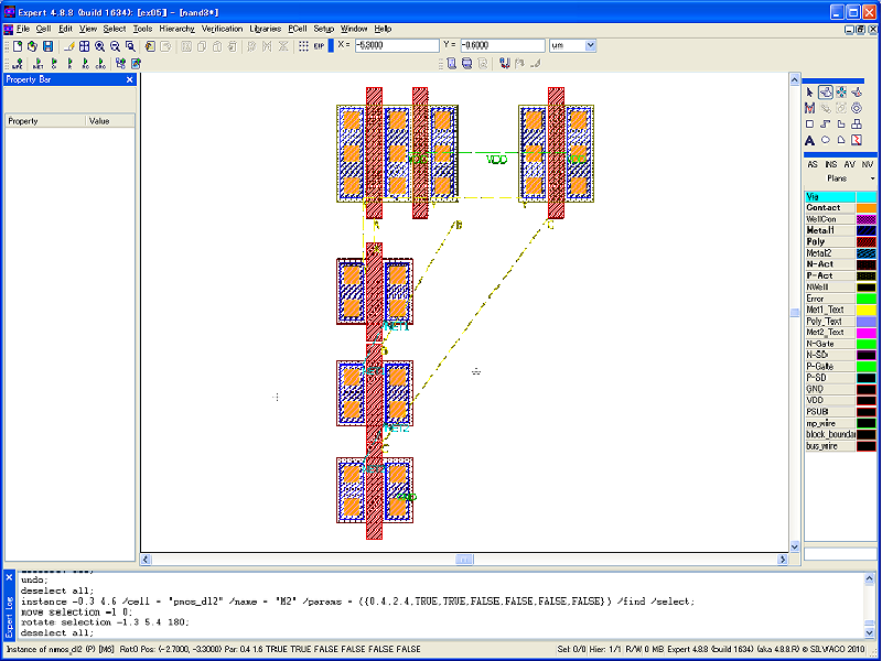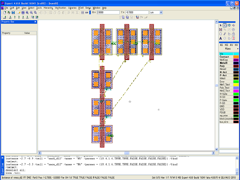 - Select File->Open in the Expert main window to load a project file exp_example_05.eld, and open the top cell NAND3.
