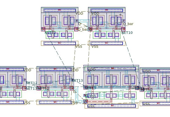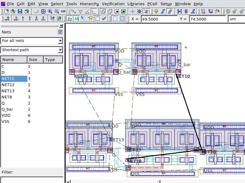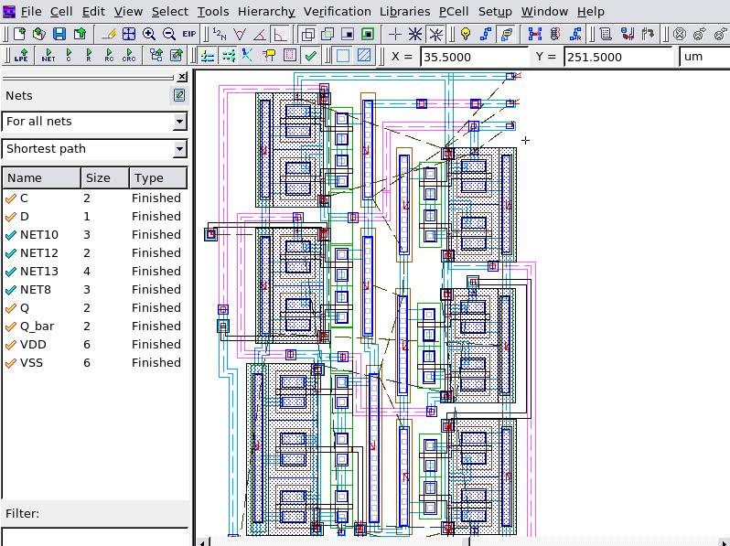 Once the routing of any net is complete, use Reextract Connectivity to update the internal node database and then toggle the option Tools->Netlist Driven Layout->Update Nets and the Nets window will place a check mark next to the nets that are completely routed and mark them as "Finished". Figure 3 shows the completed DFF circuit with the Nets window showing that all nets are routed.
