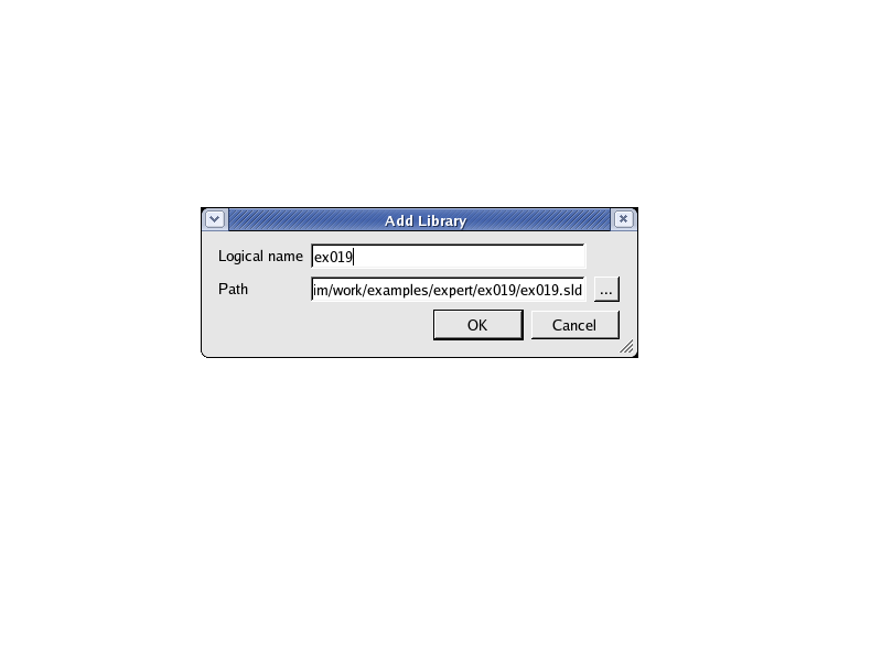 Click the file browser button (with three dots (...)), change the File type to Expert Shared Files(*.sld), select the ex019.sld on your disk and click Open. Then add the ex019.sld to the Add library dialog and click OK (see add_library_dlg.png ).