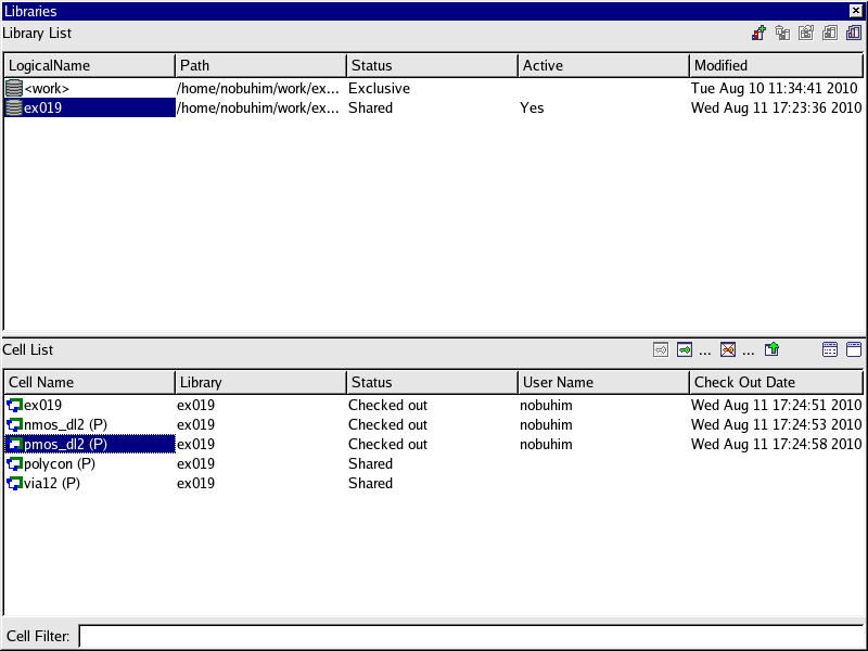 You must check out a cell from a shared library when you want to edit. Only one user may check out a particular cell at any given time. The remaining users will see the previous version of the cell until it is checked in. - Cancel check out for the selected cells