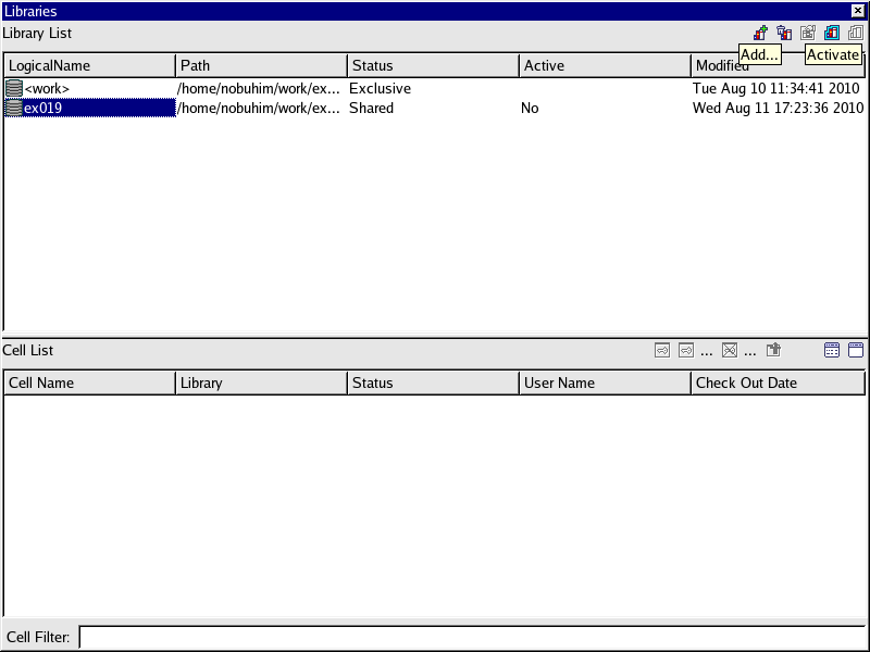 The Library Setup panel contains the list of libraries defined for your workspace. If you open a project that contains cells from some library, this library is automatically activated if it was presented in the list. All other libraries must be added to this list manually using the Add command button. To use cells from a library, activate it by clicking the Activate button (see libraries_setup.png ). For the edited cell (either opened directly or through Edit in Place (EIP) commands) the following version control commands are available directly from the Libraries->Edited Cell and from the Version Control Bar and from the Library Setup dialog.