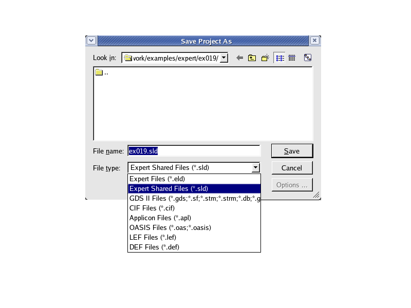 - Set the File type to Expert Shared Files(*.sld), which changes the File name to ex019.sld automatically (see save_as_dlg.png ).