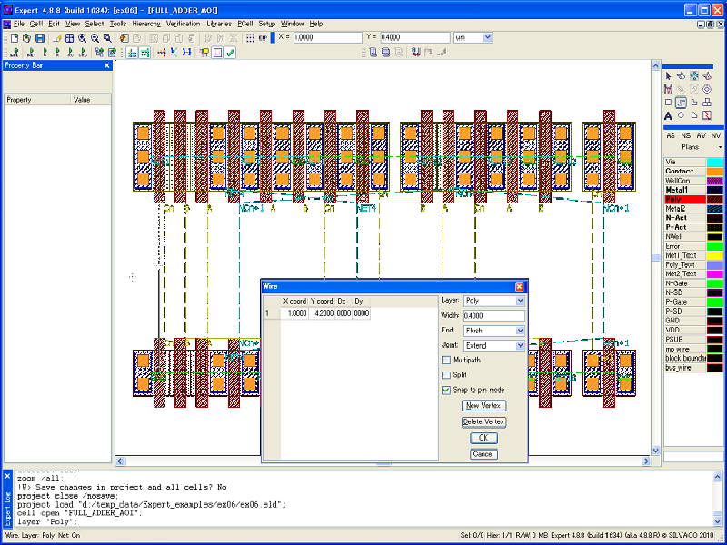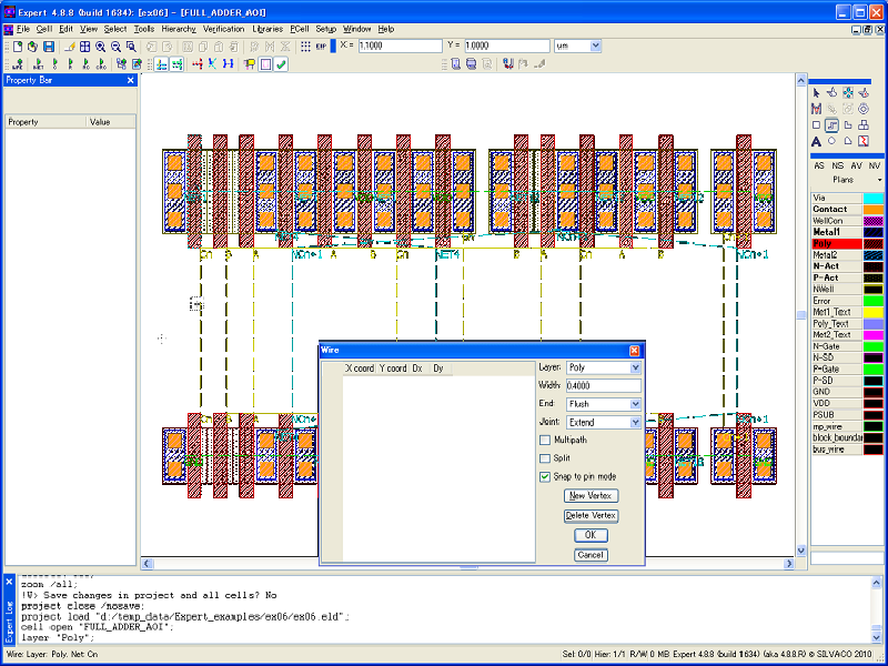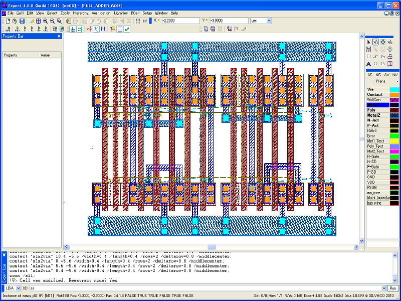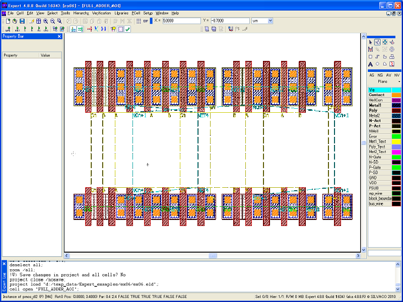 - Select File->Open in the Expert main window to load the project file editing_ex08.eld, and open the top cell FULL_ADDER_AOI (see 1_initial_placement.png ).
