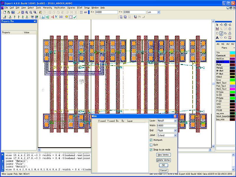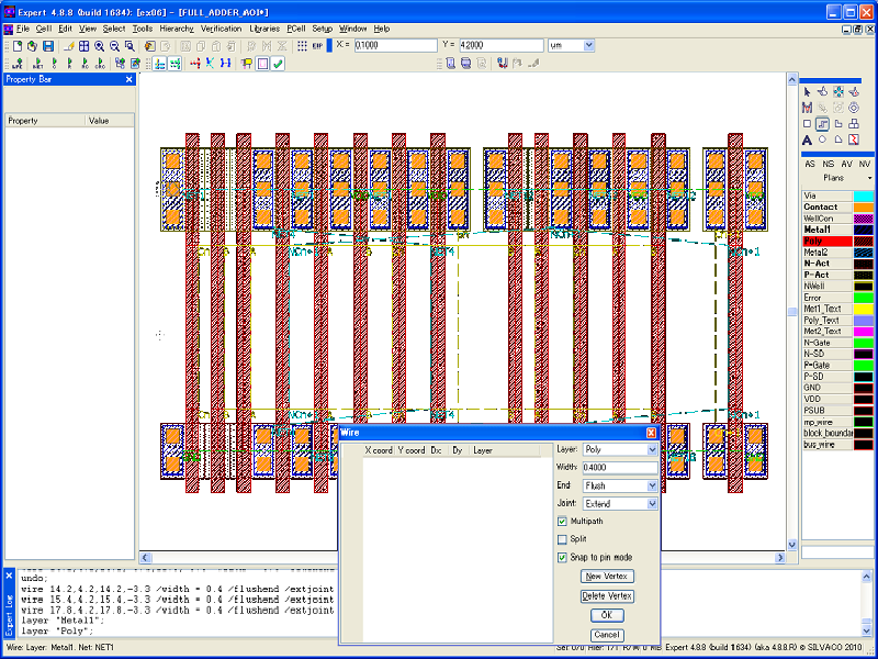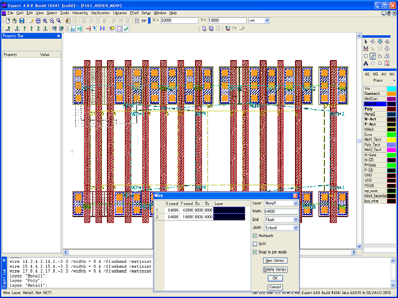 Wire stitching can also be performed by enabling the Multipath mode in the Creating Wires command form, provided that technology contacts between the interconnect layers are defined.