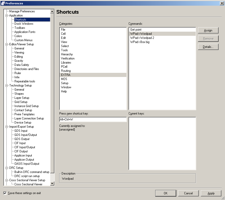 Each menu item can be assigned to a shortcut in order to facilitate the layout task. The menu Setup->Shortcuts->Setup opens the Expert Preferences window .