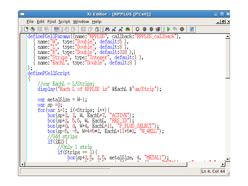 Open the "RPPLUS" cell, then a Script panel for RPPLUS will appear automatically. This PCell is created using JavaScript, and requires a "callback:" keyword for callback in definePCellParams.