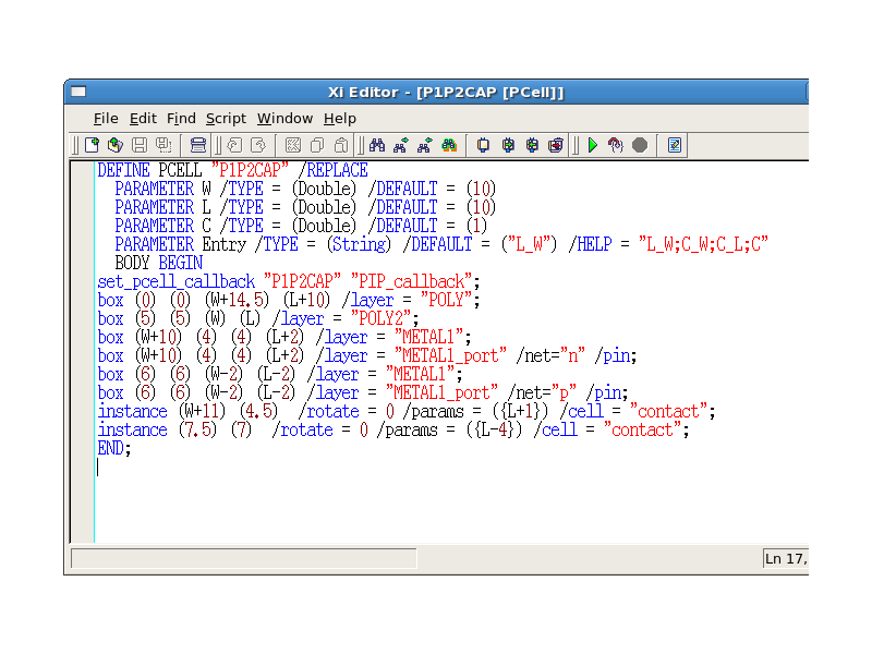 Open the "P1P2CAP" cell, then a Script panel for P1P2CAP will appear automatically. This PCell is created using LISA, and requires a "set_pcell_callback" function in the BODY block.