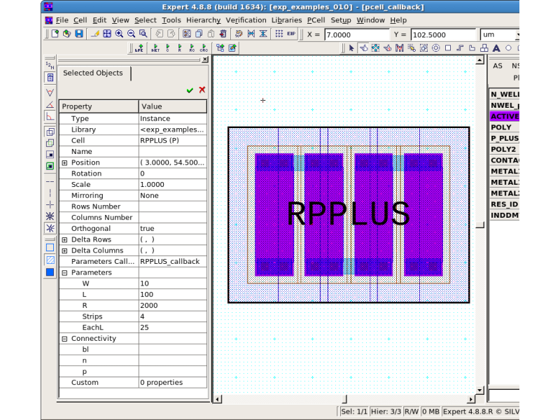 Open the "pcell_callback" cell as in pcell_callback_layout.png . Select the RPPLUS PCell in the layout as in rpplus_layout.png .