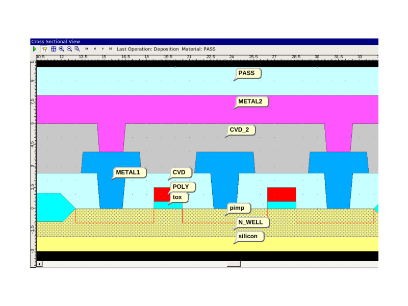 The setup of the cross section information is created using Deposition, Etching, Implantation, Diffusion, and Oxidation according to the cross section of each process. This example is set up for 2poly/2metal process.