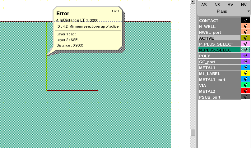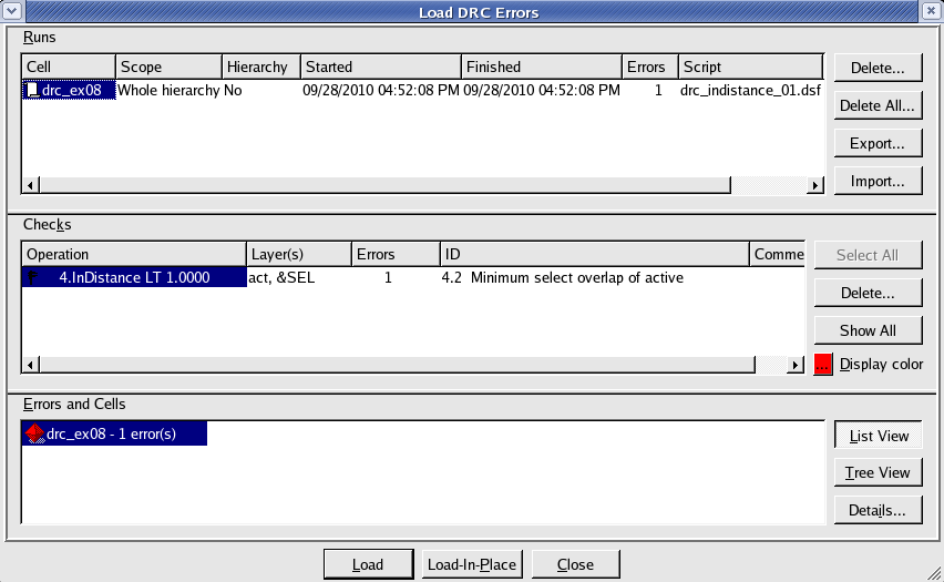 - Select the check and press the Load button located at the bottom of the window. Then choose Verification->DRC->Errors->First error to display the error in the layout, as shown in Figure 3 .