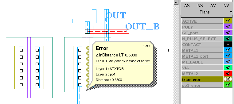 To understand the effect of the LayerR1 and LayerR2 , open the layout cell "indist_2" , and run the DRC script "drc_indistance_02.dsf" . You should see one DRC error and the creation of two new layers txtor_error and po1_error , as shown in figure 5 .