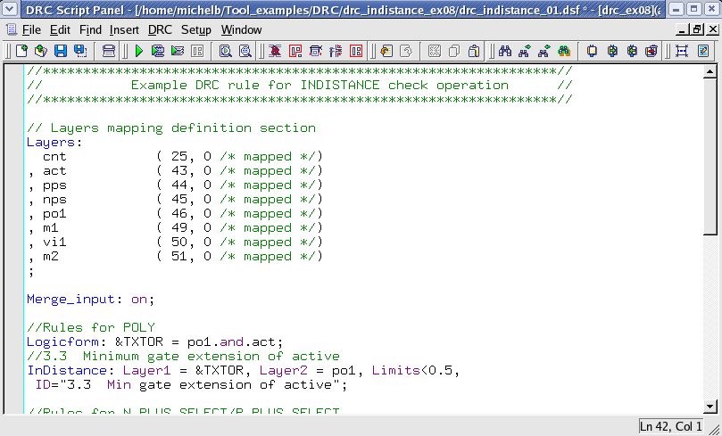 - Choose Verification->DRC->DRC Script panel . In this new window, choose File->Open... and select "drc_indistance_01.dsf".