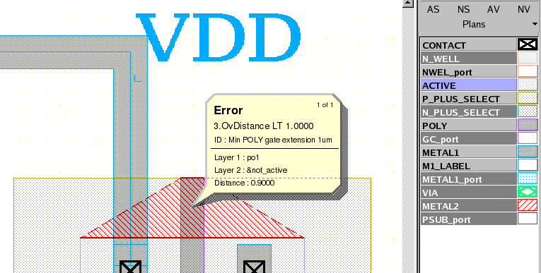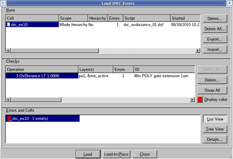 - Select the check and press the Load button located at the bottom of the window. Then choose Verification->DRC->Errors->First error to display the error in the layout, as shown in Figure 3 .