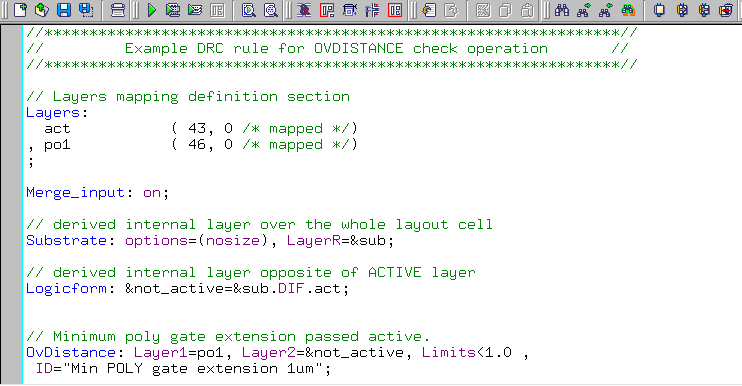 //****************************************************************// // Example DRC rule for OVDISTANCE check operation // //****************************************************************// // Layers mapping definition section Layers: act ( 43, 0 /* mapped */) , po1 ( 46, 0 /* mapped */) ; Merge_input: on; // derived internal layer over the whole layout cell Substrate: options=(nosize), LayerR=⊂ // derived internal layer opposite of ACTIVE layer Logicform: ¬_active=&sub.DIF.act; // Minimum poly gate extension passed active. OvDistance: Layer1=po1, Layer2=¬_active, Limits<1.0 , ID="Min POLY gate extension 1um"; // END of DRC check