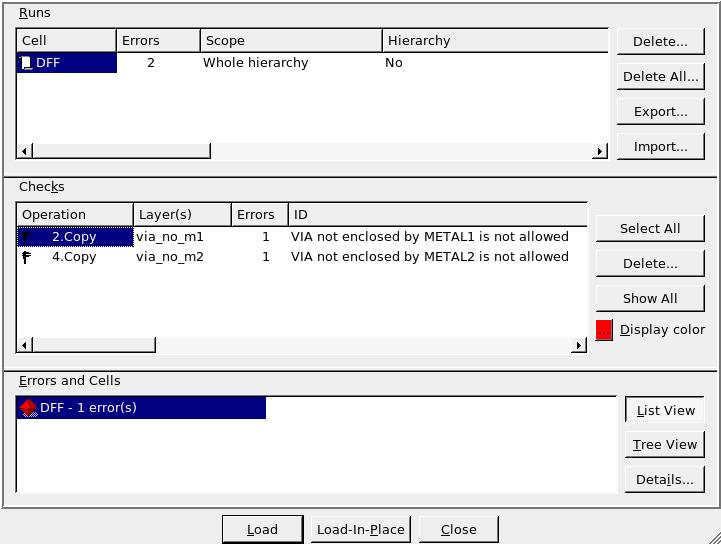 To run the example DRC script, select the menu item DRC->Run from the DRC script panel with the drc_ex12.dsf script loaded. Once the DRC is complete, return to the Expert window containing the layout and select Verification->DRC->Errors->Load Errors. This will open the error window containing all errors found by the DRC script. As seen in Figure1 , there are a total of two errors; one for VIA/METAL1 violation and the other for VIA/METAL2 violation.
