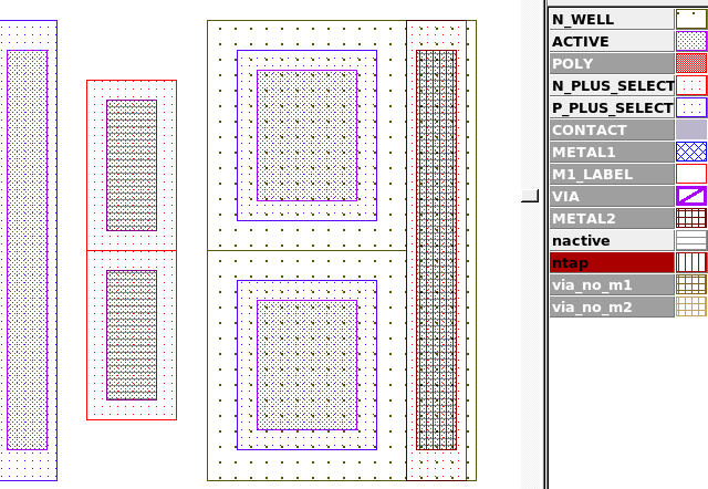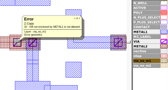 By selecting the first error and clicking on the "Load" button in the error window and selecting the Expert menu item Verification->DRC->Errors->First Error the layout view will be taken to the first violation as seen in Figure2 , which shows a VIA shape with only METAL2 present. Following the same steps for the next error type will show Figure3 , which is a violation caused by a VIA geometery only partially covered by METAL2. Figure4 shows the scratch layer "ntap" that was generated by the DRC script commands, which can be used as the primary layer in other DRC rule checks that focus on this type of well tap.
