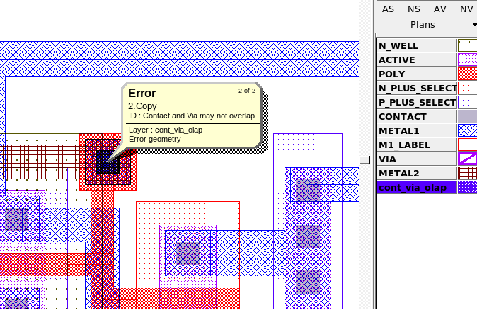 By selecting the first error and clicking on the "Load" button in the error window and selecting the Expert menu item Verification->DRC->Errors->First Error the layout view will be taken to the first violation as seen in Figure2 , which shows a CONTACT shape and VIA shape partially overlapping each other. Selecting Verification->DRC->Errors->Next Error will move the layout view to the second violation as seen in Figure3. In this case, the CONTACT shape and VIA shape are coincident with each other.