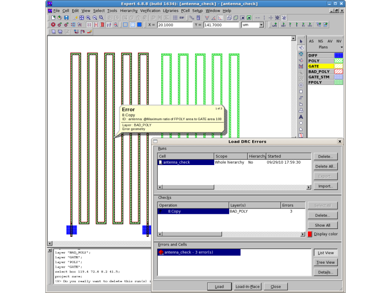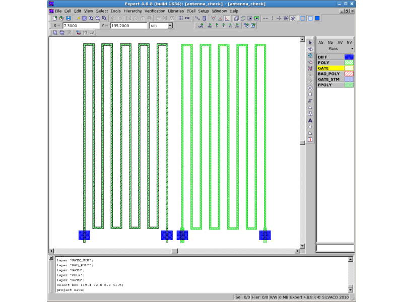 As a result, a layer -BAD_POLY- will be created with a geometry, which violates antenna checks in only the left side of the layout, because "FPOLY" on the right side of the layout is connected with the "GATE" layers whose area is two times larger than the left side one. antenna_check_LogR.ant is the output geometry log file. antenna_check_LogA.ant is the antenna violation log file.