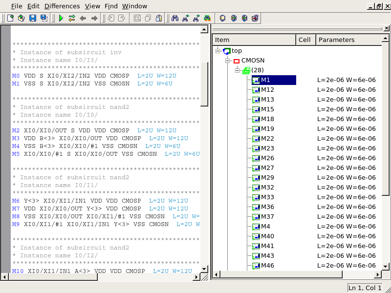 The netlist extraction can now be run, with Verification->Extraction->Hipex-Net->Run from the main Expert window. This step is necessary even if only the parasitics are required, because the full connectivity must first be extracted to identify all the nodes. When the netlist extraction has completed a window will popup, inviting you to Close, Open Netlist or Show Detail (ie. show the run log). The Open Netlist option is worth noting; rather than simply showing a text netlist, it opens a Netlist Editor window (see figure3 ), and shows both the text netlist (on the left) and a hierarchy display (on the right). These are linked; clicking on a device in the hierarchy display will highlight the corresponding item in the text netlist. It is also linked to the layout, so clicking on the item in the hierarchy display will also jump to the relevant cell in the Expert layout editor.