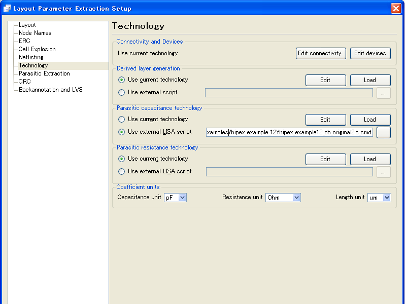 7) Open the "Layout Parameter Extraction Setup" dialog again, and specify another parasitic capacitance technology file customized_c_cmd.lisa in the "Technology" page. This technology file contains user-defined procedures taking into account wire width.
