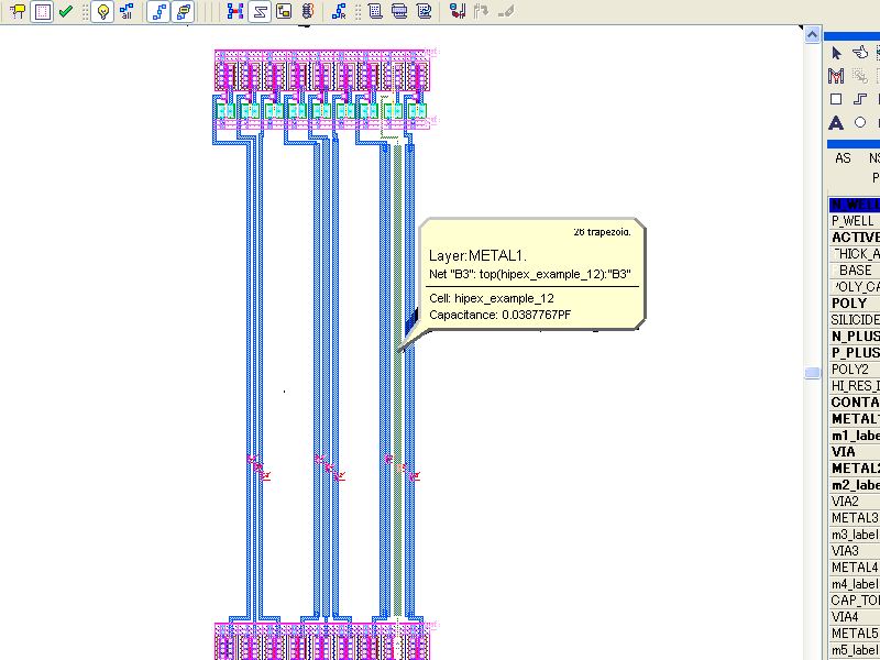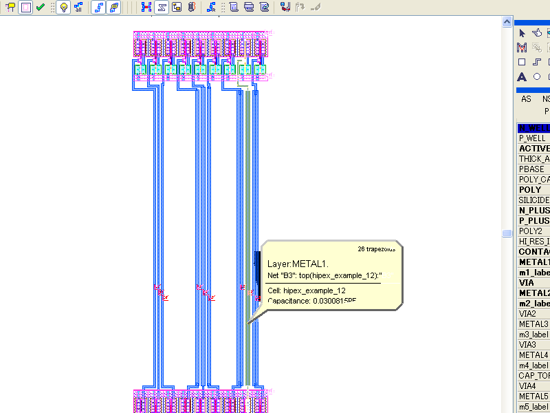6) Select Verification->Node-Probing->Pick Node command, and click each of METAL1 wires. It shows the value of extracted capacitances (see figure3 ). There is no essential difference in values for wires with different width in this case