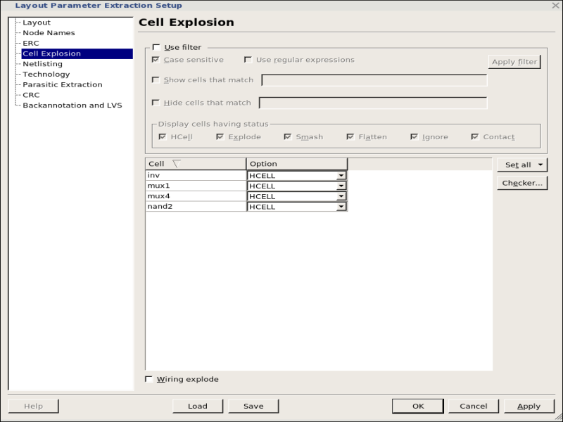 Start the Expert layout editor(either with the command expert or by clicking the expert icon). From the main menu bar at the top, click File->Open to pop up the Load Project menu, navigate to the directory into which the hipex_ex02.eld design database file was downloaded and Open it.This will call up the Open Cell(s) menus, and here double-click mux4, the top-level cell. By default this shows the hierarchical view of the design; you can see the full details ( figure1 ) by clicking View->Cell View->Flat. From the main Expert menu, click Verification->Extraction->Setup ; this pops up the Layout Parameter Extraction Setup panel (see Figure2 with Cell Explosion page shown). The pages within this panel are accessed using the menu on the left. The controls on these pages are used to load the required Hipex technology files and change any settings to customize the extraction. Refer to previous example (hipex_ex01) for overview of these controls.