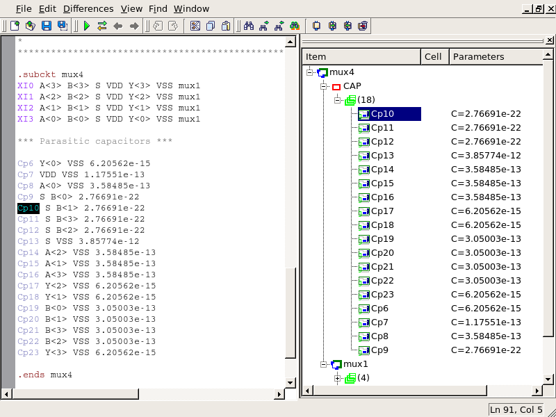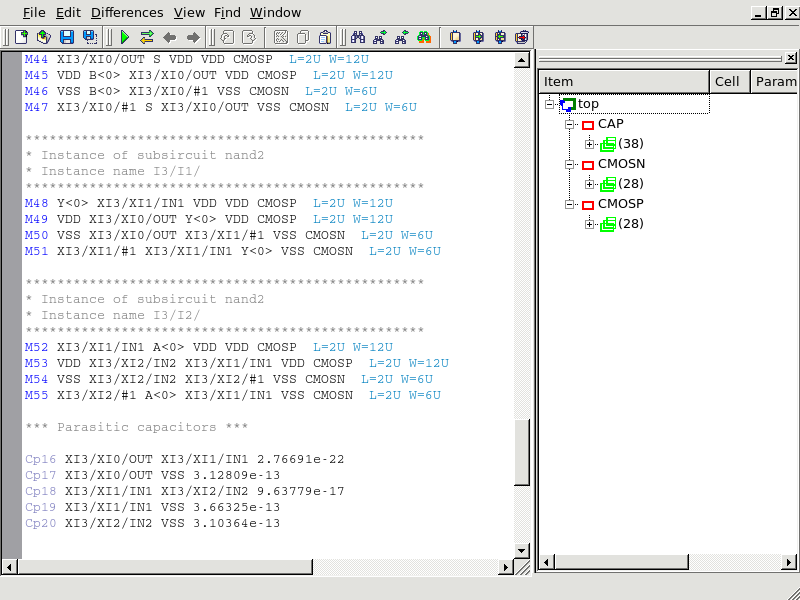 To perform parasitic capacitance extraction, invoke Verification->Extraction->Hipex-C->Run command from the main Expert window. When the parasitic capacitance extraction has completed, a window will popup, prompting to Close, Open Netlist or Show Detail (ie. show the run log). The Open Netlist option is worth noting; rather than simply showing a text netlist, it opens a Netlist Editor window (see Figure3 ), and shows both the text netlist (on the left) and a hierarchy display (on the right). These views are linked; clicking on a device in the hierarchy display will highlight the corresponding item in the text netlist. It is also linked to the layout, so clicking on the item in the hierarchy display will also jump to the relevant cell in the Expert layout editor. As with the plain netlist extraction, the parasitic extraction is actually done in different stages internally; the first stage is to create databases holding information about the parasitics, and the second stage is to generate netlists or parasitic files from the databases. So after creating the parasitic capacitance netlist, you can go into the Verification->Extraction->Netlister menu and create other types of netlists, including a flat netlist from the hierarchical databases: Verification->Extraction->Netlister->C Flat Spice Netlist (see Figure4 ).