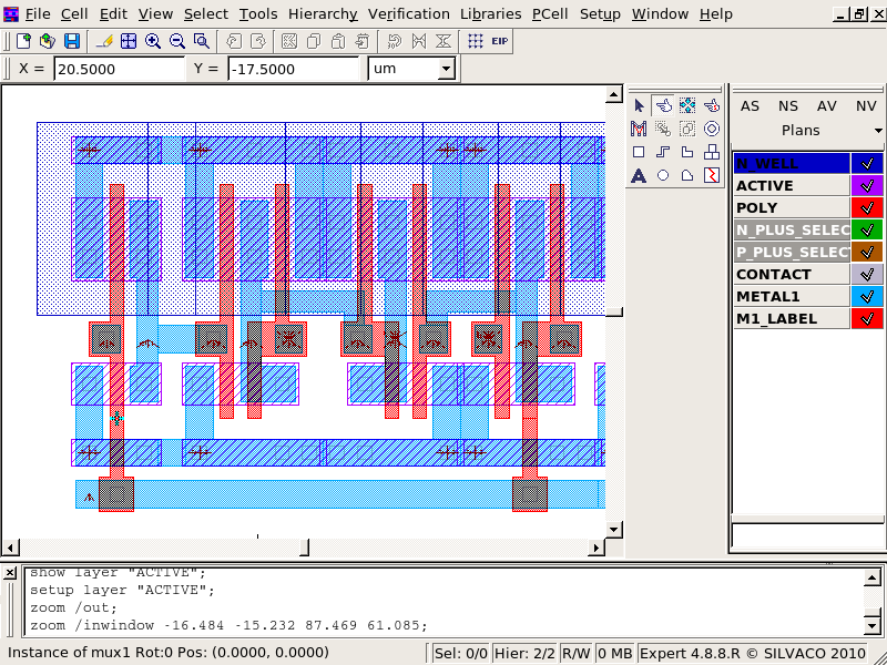 First start the Expert layout editor program, either with the command expert or by clicking the expert icon. From the main menu bar at the top, click File --> Open to pop up the Load Project menu, navigate to the directory into which the hipex_ex05.eld design database file was downloaded and Open it. This will call up the Open Cell(s) menus, and here double-click mux4 , the top-level cell. By default this shows the hierarchical view of the design; you can see the full details by clicking View --> Cell View --> Flat (see figure1 ).
