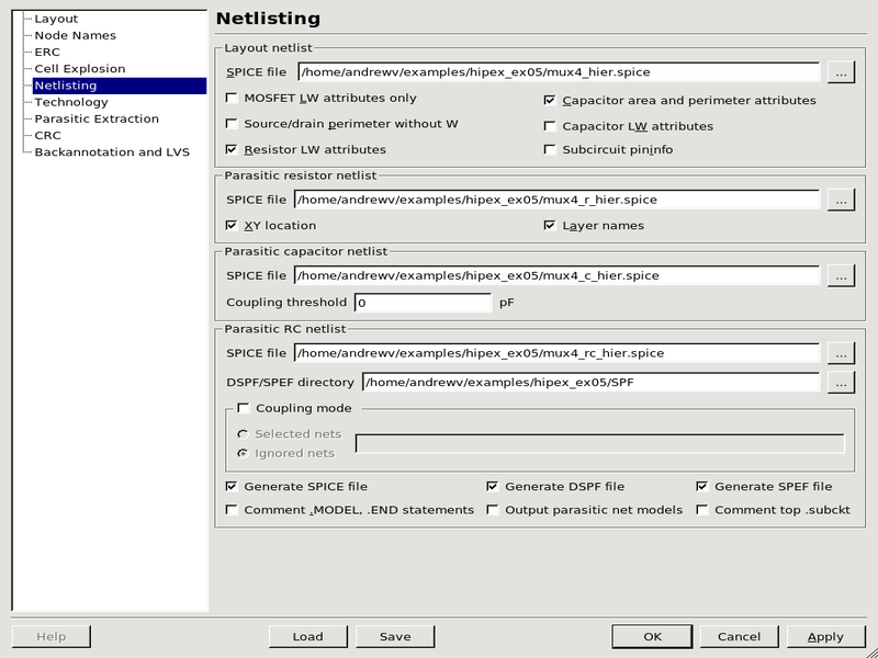 The fifth page, Netlisting, controls the details of the extracted netlists and parasitic files which will be generated. Default filenames for all the possible types of output are generated based of the current design/cell. In the final section for Parasitic RC netlist you can select the output netlist format; the standard SPICE format is enabled by default, but you can also enable DSPF and SPEF formats for digital timing or STA back-annotation. You may select any of the formats simultaneously.