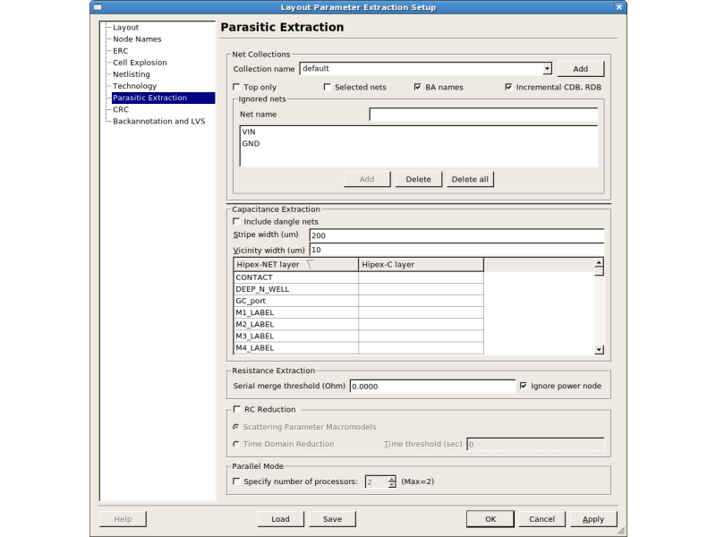 Hipex-RC provides not only the selected nets extraction function but also the ignored nets function. When this function is used, Hipex-RC doesn't extract parasitic resistors and capacitors for the ignored nets. An example setup is shown on figure6. This function can be used in the same way as the "selected nets" function, and is just as useful.