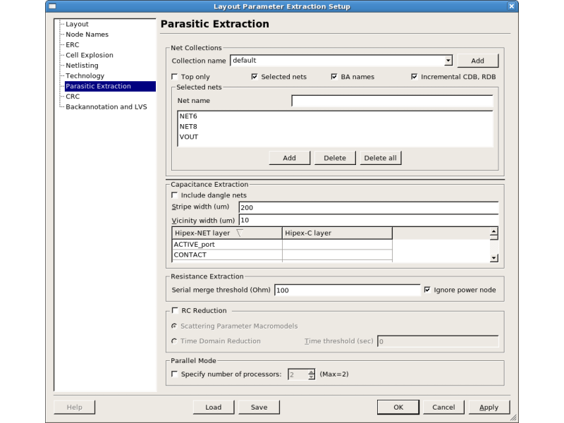 Hipex-RC provides ways to reduce the size of a parasitic RC netlist for post layout simulation of a large layout block. One of them is the selected nets extraction function. This function is effective for reducing the run time of Hipex-RC. When this function is used, Hipex-RC extracts parasitic resistors and capacitors only for the selected nets of the critical path.