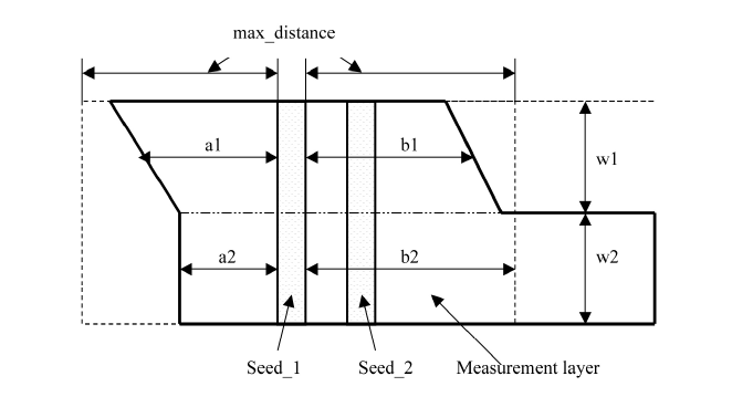 In the Figure1 , the measurement layer polygon is split into trapezoids with sides that are parallel to the coincident edges of the layer and the device seed shape. Each trapezoid provides three values a, b, and w for the enclosure vector element. The max_distance parameter defines the size of the search window and so defines the maximum value for a and b.