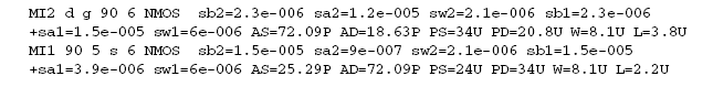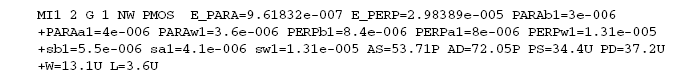 !!!!!!!!!!!!!!!!!!!!!!!! PROCEDURE FOR CALCUL SA, SB and SW !!!!!!!!!!!!!!!!!!!!!!!!!!!!!!!!!!!!!! define procedure sum_encl parameter ENCL parameter AB do begin N_ENCL = ENCL.SIZE; SUM = 0; IF(N_ENCL NEQ 0) THEN BEGIN I = 0; LOOP BEGIN I = I + 1; IF(AB EQL "A") THEN ( SUM = SUM + ENCL[I].A ) ELSEIF (AB EQL "B") THEN ( SUM = SUM + ENCL[I].B) ELSE ( SUM = SUM + ENCL[I].W); IF (I EQL N_ENCL) THEN (LEAVE LOOP); END; END; IF(SUM NEQ 0) THEN (SUM = SUM) ELSE (SUM = 0); end; !! end procedure to calculate SA SB !!!!!!!!!!!!!!!!!!!!!!!!!!!!!!!!!!!!!!!!!!!!!!!!!!!!!!!!!!!!!!!!!!!!!!!!!!!!!!!!!!!!!!!!!!!!!!! !!!!!!!!!!!!!!!!!!!!!!!!!!!!Start of generic MOS procedure!!!!!!!!!!!!!!!!!!!!!!!! define procedure mos parameter rec parameter aux1 parameter aux2 parameter aux3 parameter aux4 parameter NP do begin W=(device_perimeter(REL_BUTTING,rec,aux1) + device_perimeter(REL_INSIDE,rec,aux1))/2; L=device_area(rec,"")/W; PI_S_OD = device_perimeter(REL_INSIDE, "S",aux2); PI_D_OD = device_perimeter(REL_INSIDE, "D",aux2); IF(PI_S_OD EQL 0) THEN BEGIN AD = device_area("D","") * W / PI_D_OD; AS = AD; PD = device_perimeter(REL_NONE,"D","") * W /PI_D_OD; PS = PD; END ELSEIF (PI_D_OD EQL 0) THEN BEGIN AS = device_area("S","") * W / PI_S_OD; AD = AS; PS = Device_perimeter(REL_NONE, "S","") * W /PI_S_OD; PD = PS; END ELSE BEGIN AS = device_area("S","") * W / PI_S_OD; AD = device_area("D","") * W / PI_D_OD; PS = device_perimeter(REL_NONE, "S","") * W /PI_S_OD; PD = device_perimeter(REL_NONE,"D","") * W /PI_D_OD; END; !______________________________________________________ ! calculation SA and SB ENCL = device_enclosure_vector(aux2, 60); SA = sum_encl(ENCL, "A"); SB = sum_encl(ENCL, "B"); SW = sum_encl(ENCL, "W"); !_______________________________________________________ !WELL PROXIMITY... SCH and SCV are enclosure vectors SCH=device_enclosure(ORIEN_PERPENDICULAR, rec, aux4, "S", 5); SCV=device_enclosure(ORIEN_PARALLEL, rec, aux4, "S", 5); N_PERP = SCH.SIZE; E_PERP = 0.0; I = 0; LOOP BEGIN I = I + 1; E_PERP = E_PERP + (SCH[I].a + SCH[I].b) * SCH[I].w; ! E_PERP = E_PERP + (PROX_PERP[I].a + PROX_PERP[I].b) * PROX_PERP[I].w; IF (I EQL N_PERP) THEN (LEAVE LOOP); END; E_PERP = E_PERP / L / 2; ! N_PARA = PROX_PARA.SIZE; N_PARA = SCV.SIZE; E_PARA = 0.0; I = 0; LOOP BEGIN I = I + 1; ! E_PARA = E_PARA + (PROX_PARA[I].a + PROX_PARA[I].b) * PROX_PARA[I].w; E_PARA = E_PARA + (SCV[I].a + SCV[I].b) * SCV[I].w; IF (I EQL N_PARA) THEN (LEAVE LOOP); END; E_PARA = E_PARA / W / 2; !_______________________________________________________ NRS = AS / W / W; NRD = AD / W / W; !_______________________________________________________ ! Netlist parameters print out section. device_set_named_enclosure_property("PERP", SCH); device_set_named_enclosure_property("PARA", SCV); device_set_property("E_PERP", E_PERP); device_set_property("E_PARA", E_PARA); device_set_property("SW", SW); device_set_property("SB", SB); device_set_property("SA", SA); device_set_property("NRD", NRD); device_set_property("NRS", NRS); device_set_property("PD", PD); device_set_property("PS", PS); device_set_property("AD", AD); device_set_property("AS", AS); device_set_property("L", L); device_set_property("W", W); end; !!!!!!!!!!!!!!!!!!!!!!!!!!!! End of generic MOS procedure !!!!!!!!!!!!!!!!!!!!!!!! !!!!!!!!!!!!!!!!!!!!!!!!!!!! Device definition section !!!!!!!!!!!!!!!!!!!!!!!! !!!!!!!!!!!!!!!!!!!!!!!!!! M(PMOS) define procedure pgate do begin rec="pgate";aux1="tpdf";aux2="pthn";aux3="acti";aux4="nxwl"; mos(rec,aux1,aux2,aux3,aux4,"P"); end;