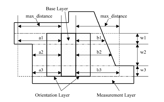 Each trapezoid provides three values a, b, and w for the enclosure vector element (see Figure4 and Figure5 ). The max_distance parameter defines the size of the search window and so defines the maximum value for a and b.