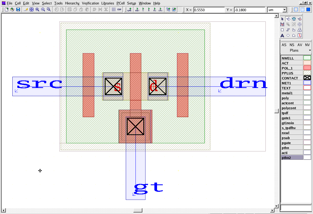 Once all the example files have been downloaded, open an EXPERT session and open the (*.eld) file called hipex_ex09.eld . Then open the top cell "hipex_09" . A cell layout view showing a single PMOS transistor as shown in Figure8 , should open.
